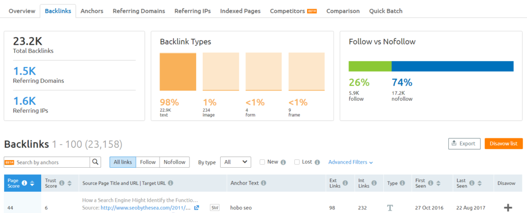The backlinks report can, in a few clicks, result in a useful overview of the target sites backlink profile. Key metrics can help spot potential trouble and you can utilise the inbuilt Disavow file feature to manage bad links moving forward. Quality links are also highighted