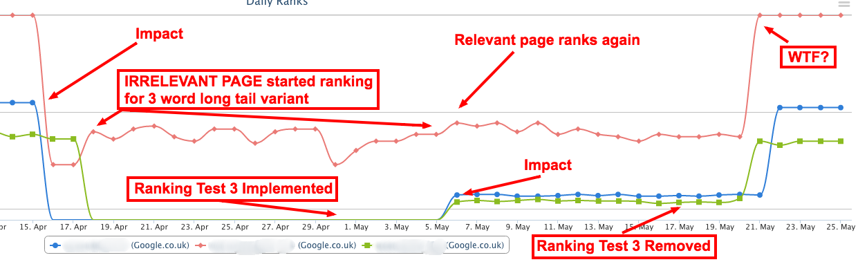 In the image below where it says “Ranking Test Implemented” I introduced one exact match internal anchor text link to the target page from another high-quality page on the site – thereby re-introducing the ‘signal’ for this exact match term on the target site (pointing at the target page).