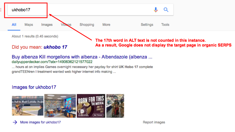 Test Results: Removing Test Focus Keyword Phrase from Internal Links and putting the keyword phrase IN AN ALT TEXT ELEMENT on the page