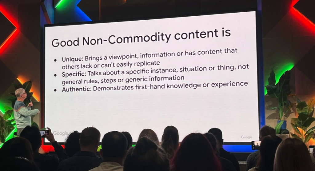 Non-Commodity Content, in short, is the new Helpful Content benchmark from Google – at least, what they are talking about on stage. It is clear that Google want to leave helpful content terminology out this time around, at least on stage. I wonder, would this advice have clarified things for Helpful Content Update victims at the time?